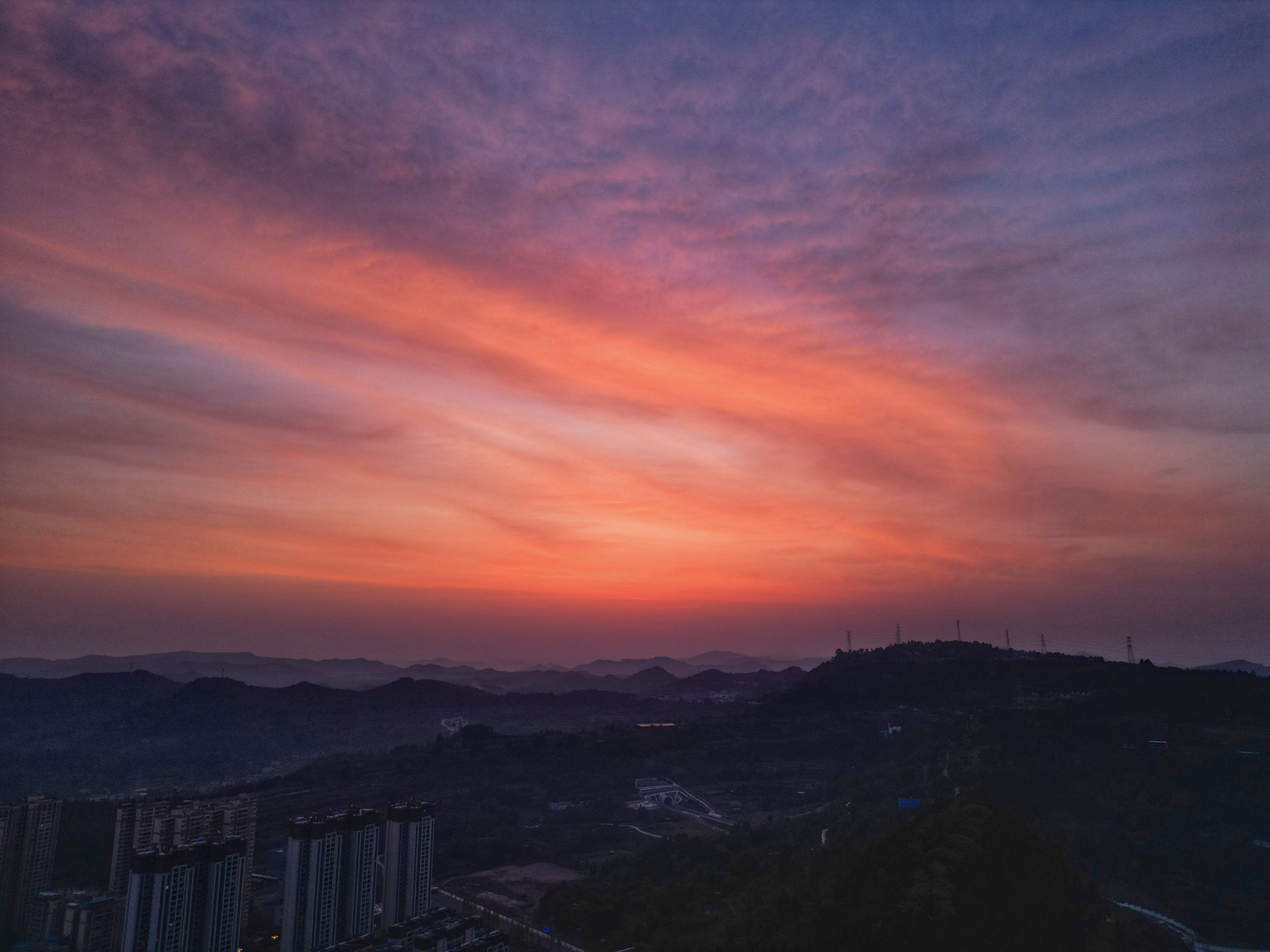 头一天看了朝霞预报,说今天早上会有火烧云,于是起了个大早,正好赶上漫天红霞的时刻。