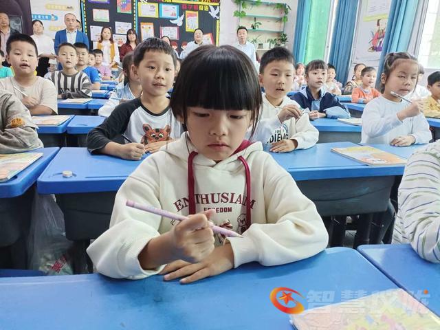 写字环节,孩子们一边背诵握笔要领“大指二指捏着,三指四指托着。小指往里藏着,笔尖向前斜着,笔杆向后躺着”,一边规范地展示写字姿势。这种生动的训练方式将行为习惯培养与趣味教学相结合。