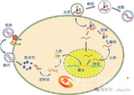 HIV侵入人体后,寻找靶细胞(T淋巴细胞)---- 与靶细胞受体CD4分子结合(相当于用钥匙打开门)---- 病毒核心组件进入靶细胞 ---- 逆转录为cDNA ---- 病毒DNA整合入宿主DNA ---- 病毒基因表达:转录 ---- 翻译病毒蛋白质、装配病毒颗粒 ---- 成熟 ---- 继续进攻其它健康靶细胞。