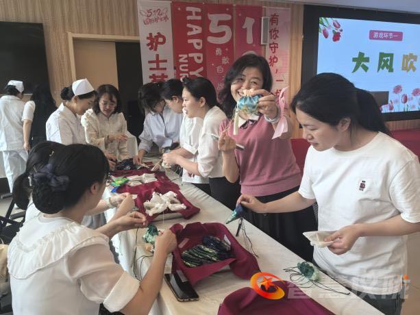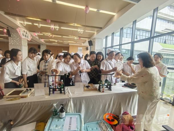在手工坊区域,大家围坐在一起,亲手体验制作中医香包和蒲扇。那一把把精美的蒲扇、一缕缕药香,不仅是对中医文化的传承,更是对护理工作人文关怀精神的生动诠释。