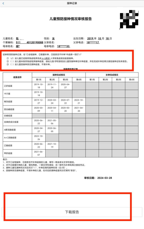 ① 接种齐全的儿童,儿童家长可以直接下载查验报告;