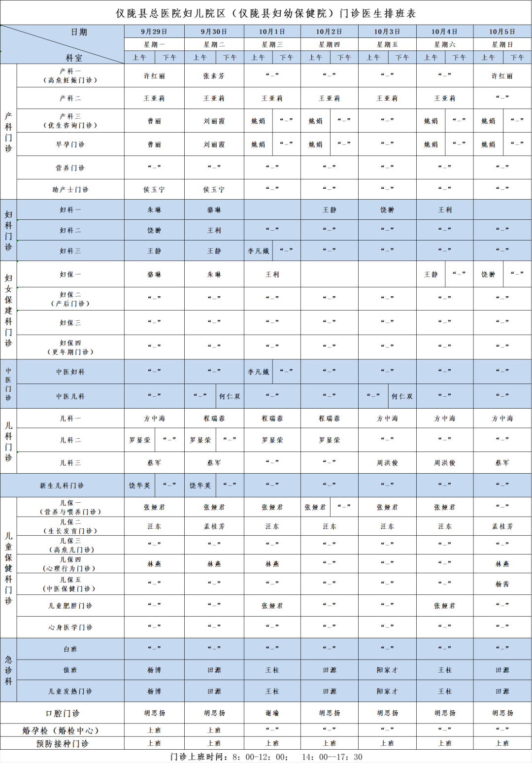 【妇幼服务】门诊医生排班表来了!(2025年9月29日-10月5日)