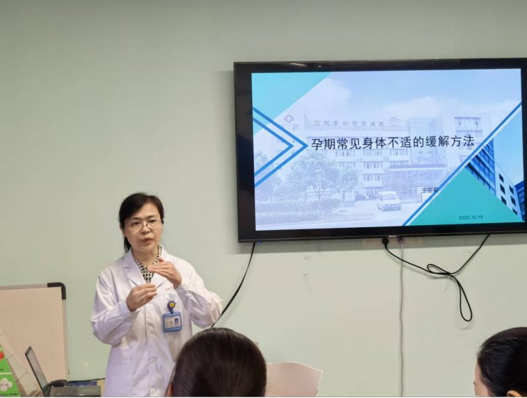 课程围绕缓解孕期不适展开,王亚莉医生采用“理论讲解+实用指导”的模式,从孕妈妈最关心的孕期身体变化与不适应对需求切入,逐一细致拆解:针对孕期普遍存在的孕吐问题,她结合孕期激素变化原理,建议采取“少食多餐+清淡饮食”的调节方式,每餐避免过饱、选择易消化食材,帮助减轻肠胃负担;在讲解缓解腰酸背痛方法时,她建议可通过热敷促进局部血液循环、轻柔按摩放松肌肉,还现场示范正确的坐姿与站姿,指导孕妈妈日常避免久站久坐,降低腰部受力;针对孕期水肿现象,她讲解到需通过抬高下肢促进血液回流,同时控制盐分摄入,避免水肿加重,切实帮助孕妈妈规避护理误区。
