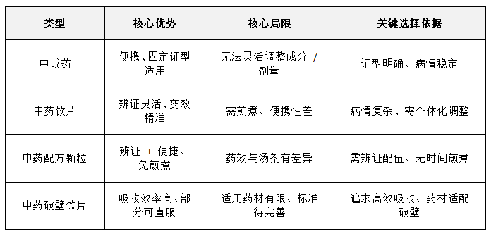 ☀适用情况:适合病情稳定、证型清晰,无特殊个体化用药需求的人群,尤其适用于日常保健、慢性病长期调理,或出差、上班族等不便煎煮中药的场景。