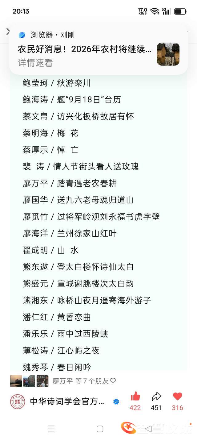 仪陇县农民诗词爱好者廖万平(即笔者)以一首绝句【踏青遇老农春耕】从海量作品脱颖而出,成功入选该书。