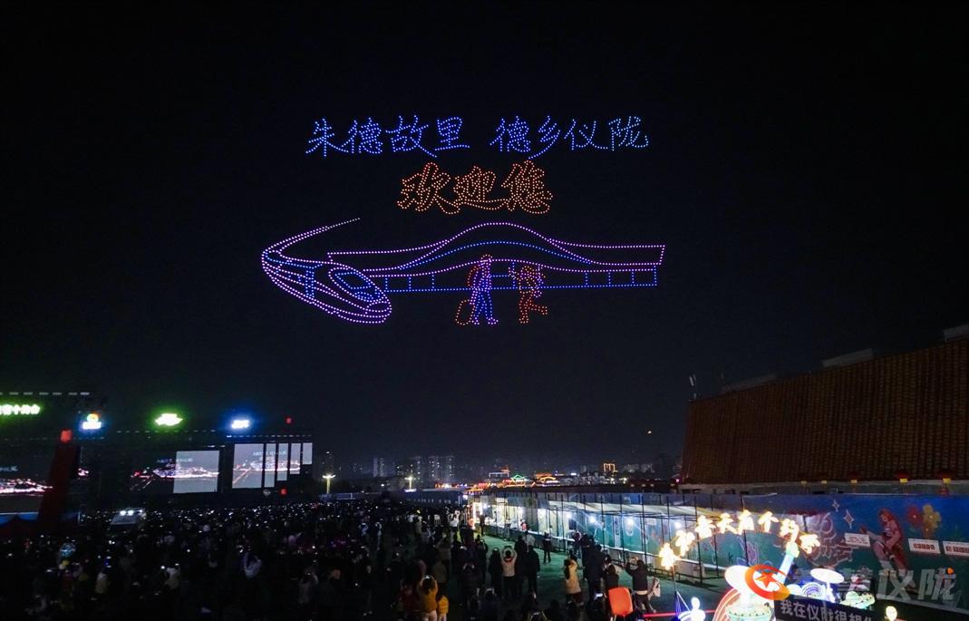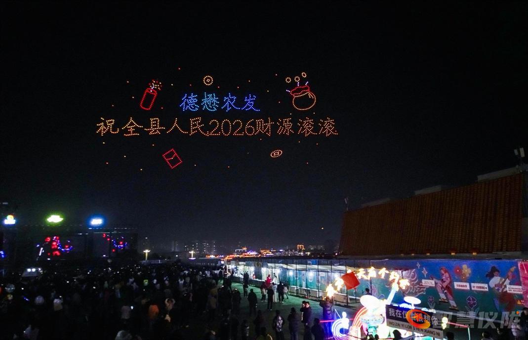 2026架无人机在嘉陵江畔进行编队表演,以科技光影点亮夜空,活动尾声,在欢快的篝火晚会,全民蹦迪中为开园日划下句点。