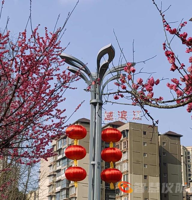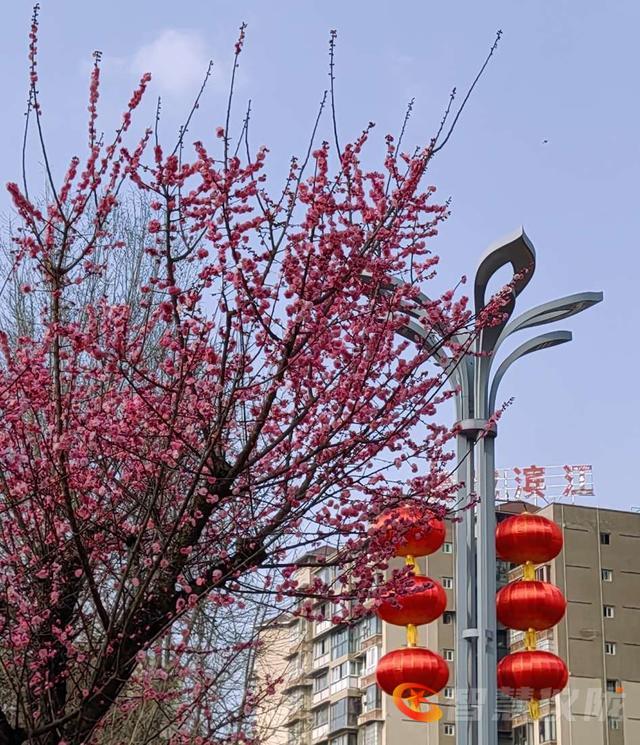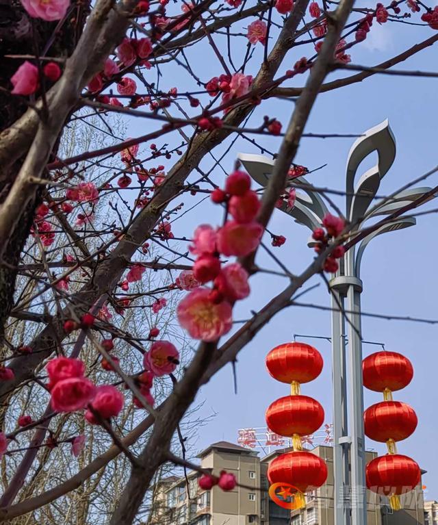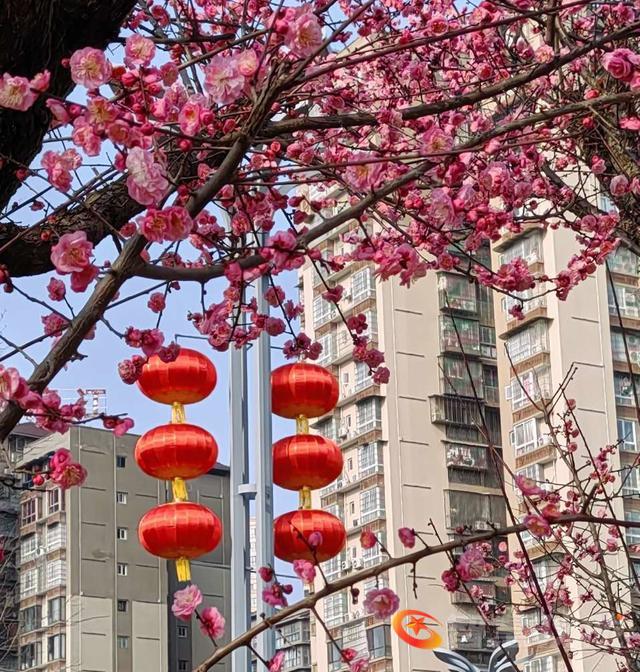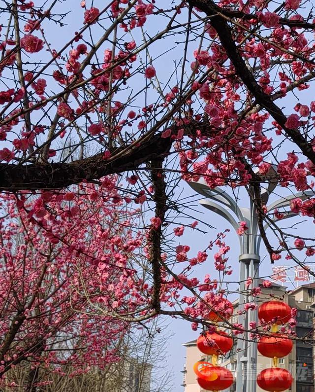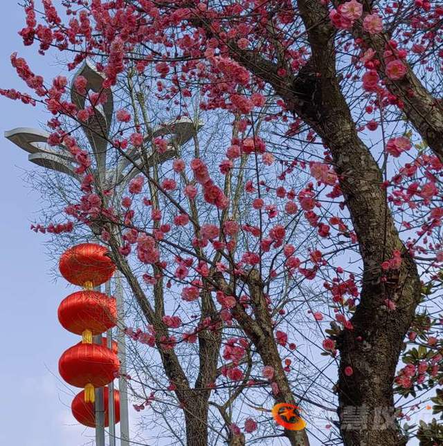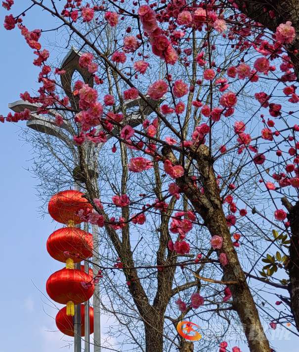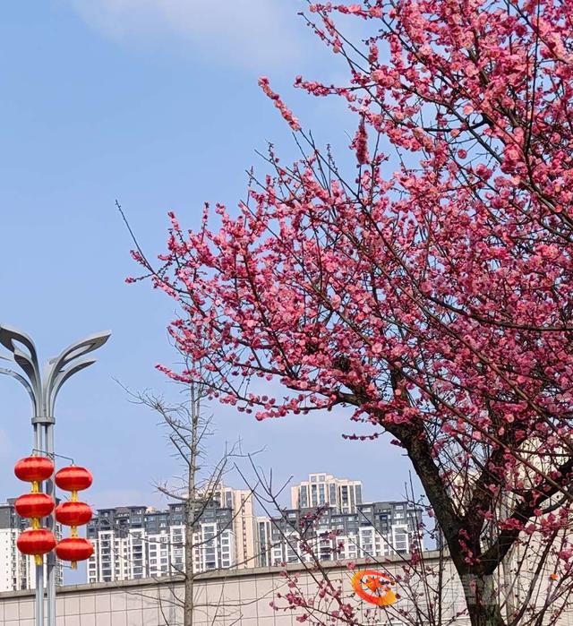 再过几天就是大年了,年味越来越浓。鲜红的红梅花,特为新年增色添彩,为年味助力。红梅花儿尽情绽放,挨挨挤挤开满了树枝,彤红的花儿与大红灯笼交相辉映,把蓝天咉得彤红,把大地映得熠熠生辉。2026的德乡将是万紫千红,2026你最棒,你最红。