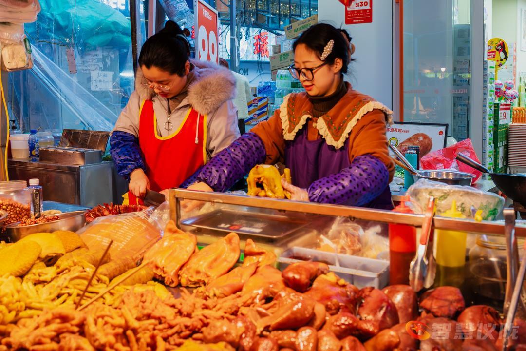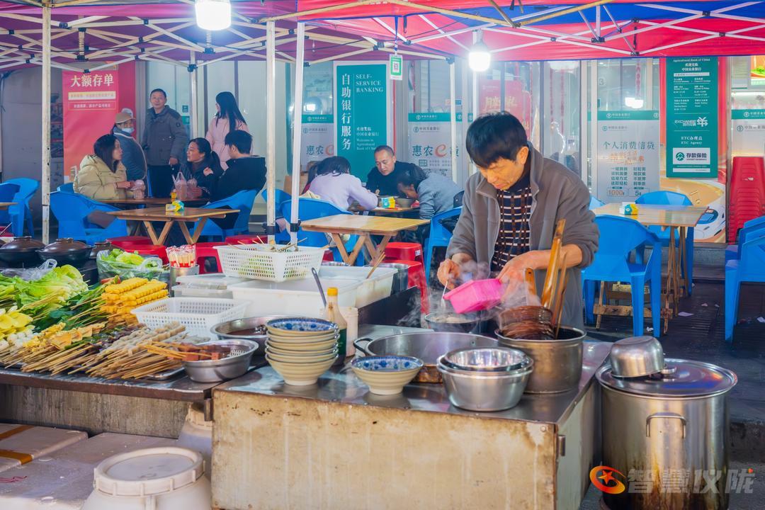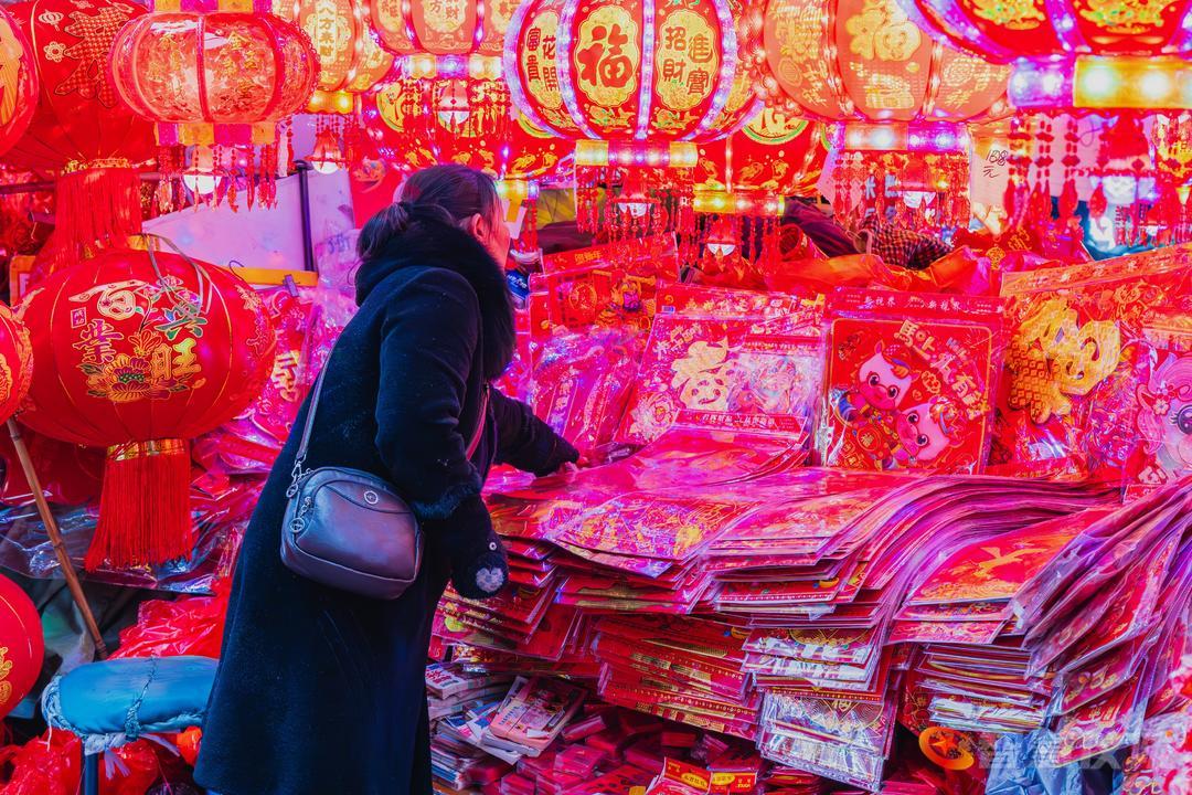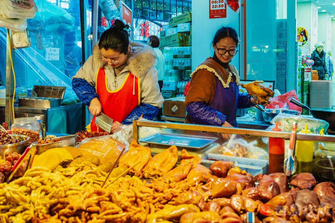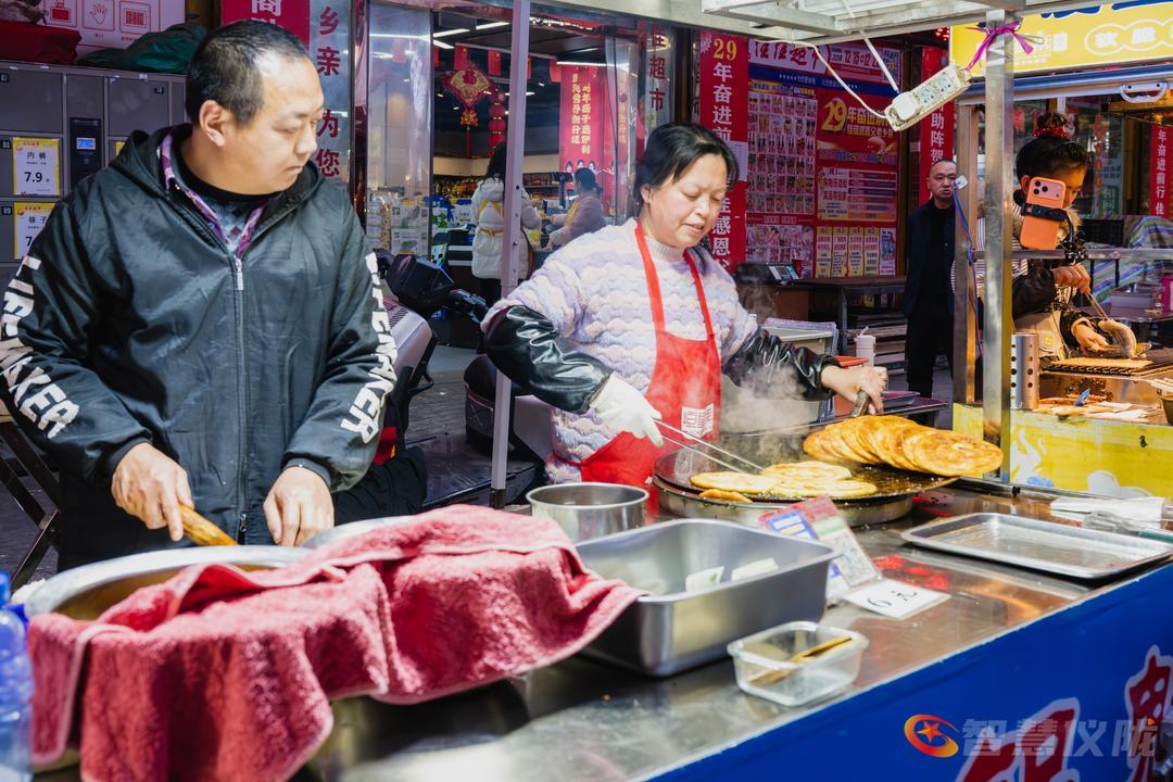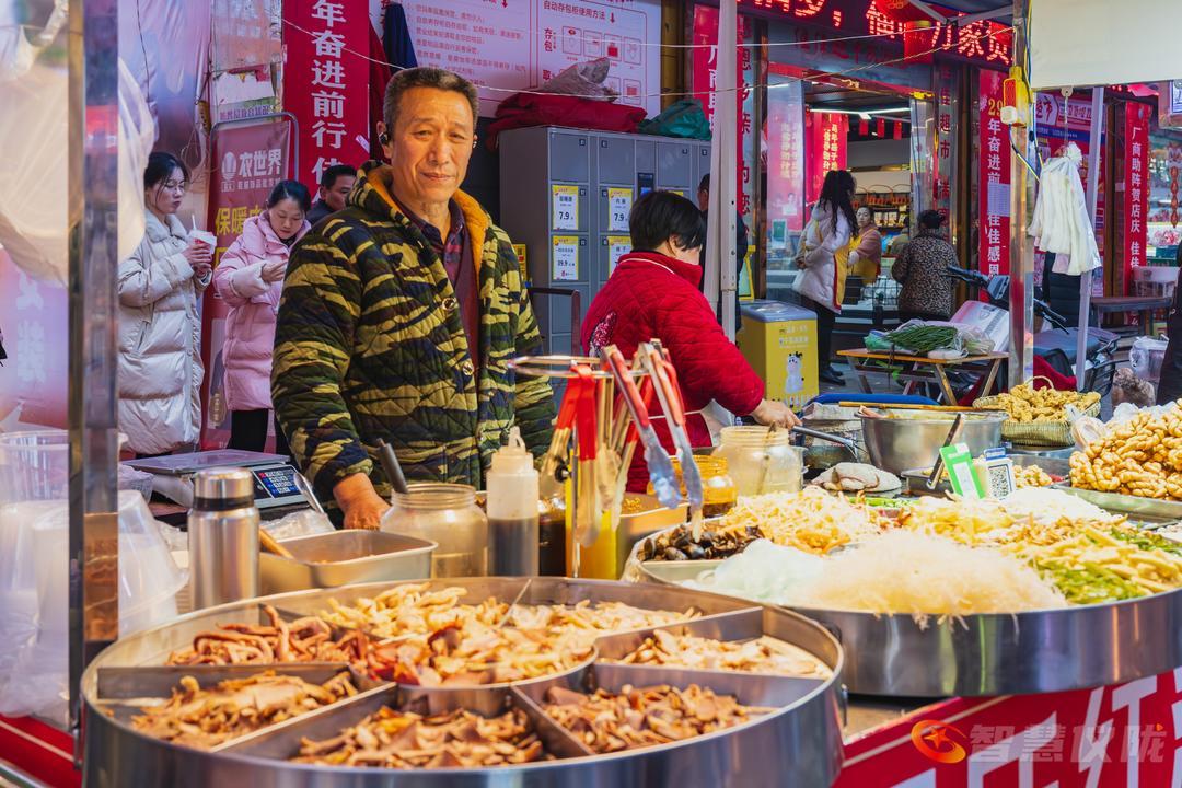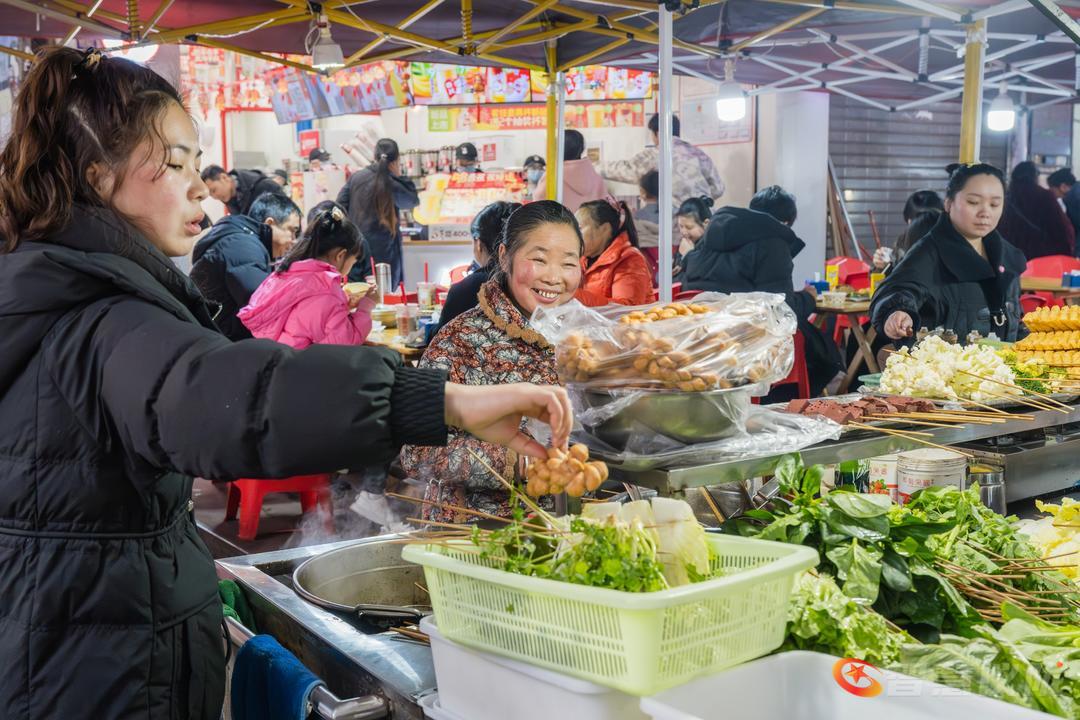 红灯笼早已挂满街头,像一串串温暖的心愿,在微风中轻轻摇曳。春联的红,与腊梅的黄交相辉映,把整条街染成一幅浓墨重彩的年画。南街的小吃一条街,是味蕾的盛宴——糖油果子金黄酥脆,锅盔香气随风飘散,凉粉酸辣爽口,酸辣粉的热气在寒夜里升腾。年货铺一字排开,干果蜜饯、花布新衣、烫金对联,琳琅满目,仿佛整条街都在为新年的到来作准备。