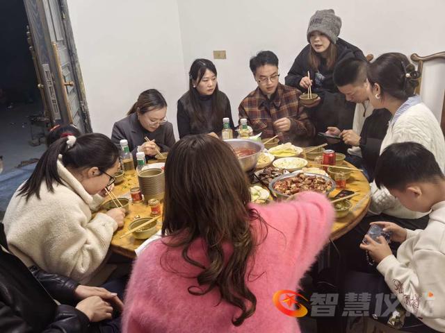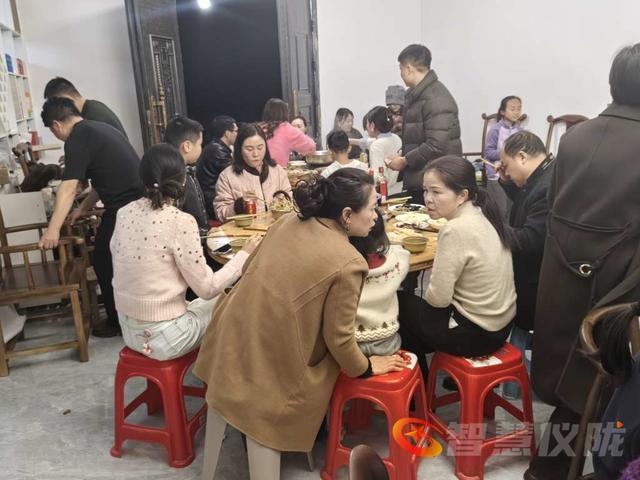 一家农舍里,聚集了近百余名亲戚朋友,大家欢聚在这里品尝着乡村年夜宴。首先品尝的是烤羊肉串,院坝里两个烤炉上烤熟了的羊肉串,香气扑鼻,大人和孩子们都津津有味地品尝着烤羊肉串,体验着新疆风味。大庭的宴席上,摆满了土特农家菜,几十种纯香的菜品,让大家饱尝了丰盛的年夜宴。