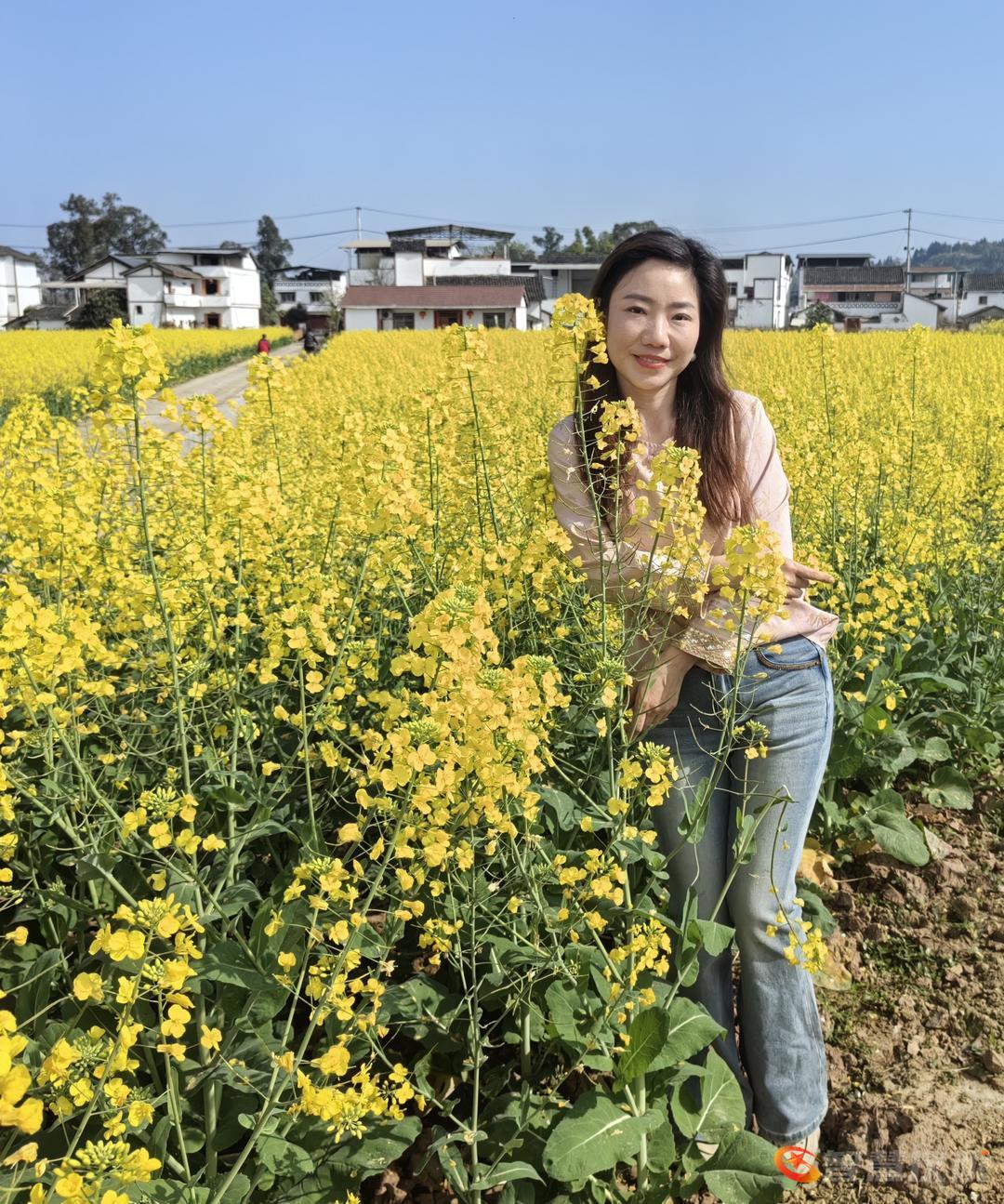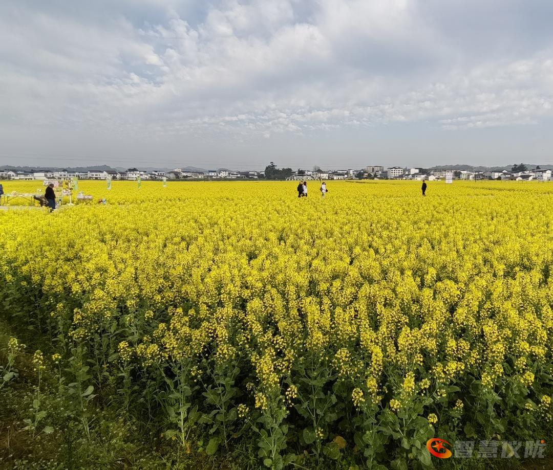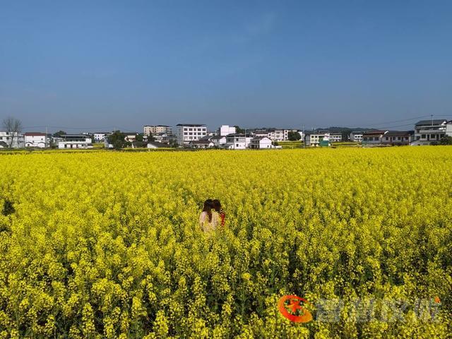 花海中有不少赏花的游人,他们在便道上、花丛中,一边欣赏漂亮的油菜花,一边用手机镜头把自已的倩影留在花海中。还有的游人,在花海的便道上打开音箱,随着悠扬宛转的旋律,蹁蹁起舞,给花海增添了热闹气氛。