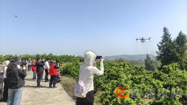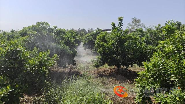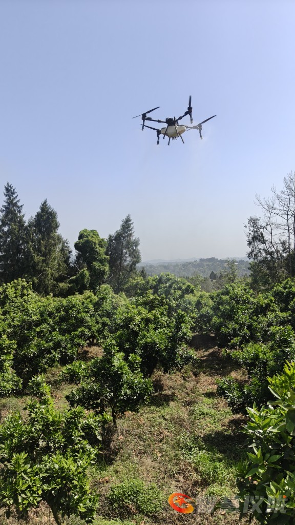 湛蓝晴空下,植保无人机掠过连片果园,细密药雾均匀洒落;果园里的自动喷灌同步运转,水雾织成朦胧轻纱,科技为果园管护插上翅膀。