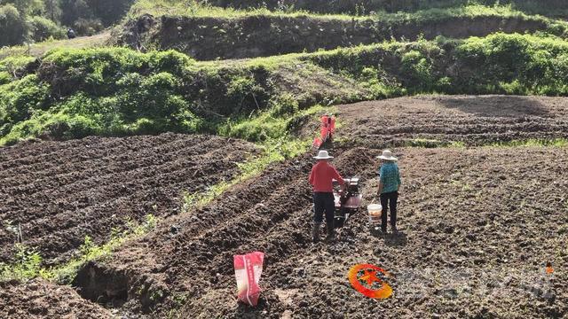 层层梯田中,黝黑泥土翻涌芬芳,农户们伴着农机的轰鸣,翻耕、起垄、播种一气呵成,地膜在阳光下闪着希望的光。