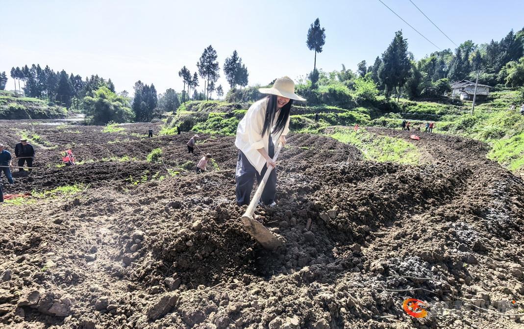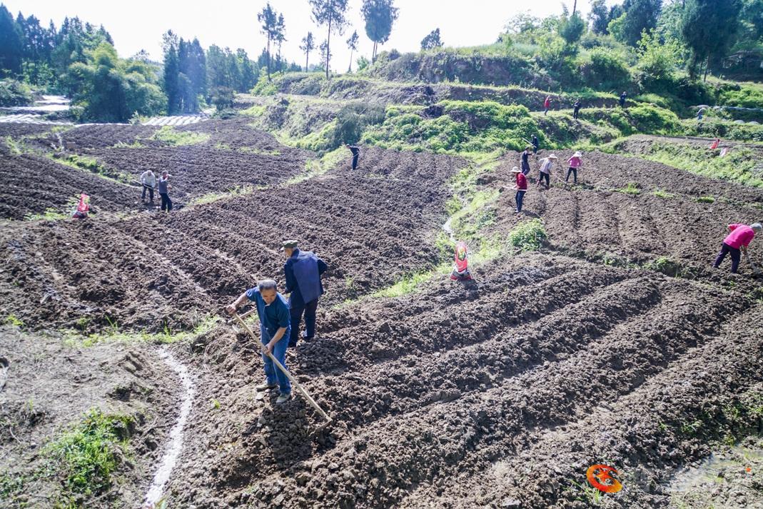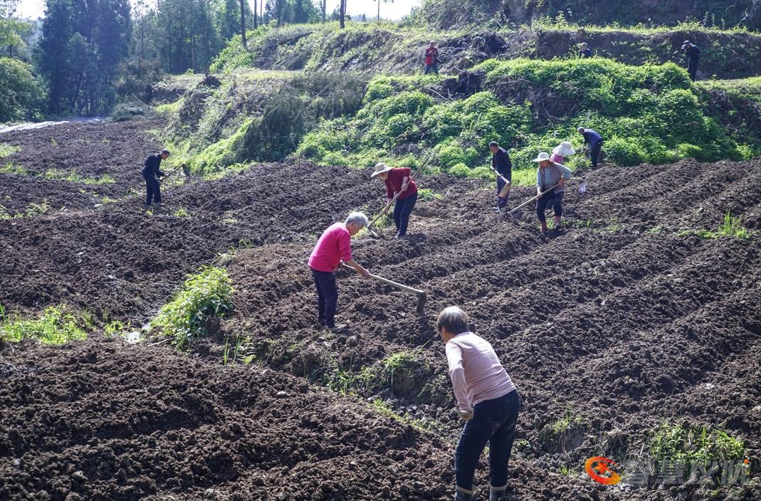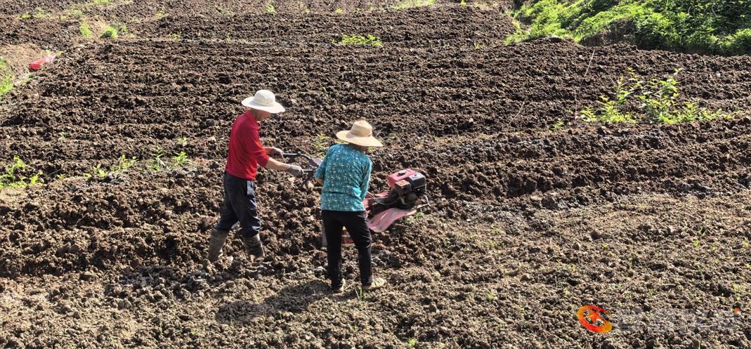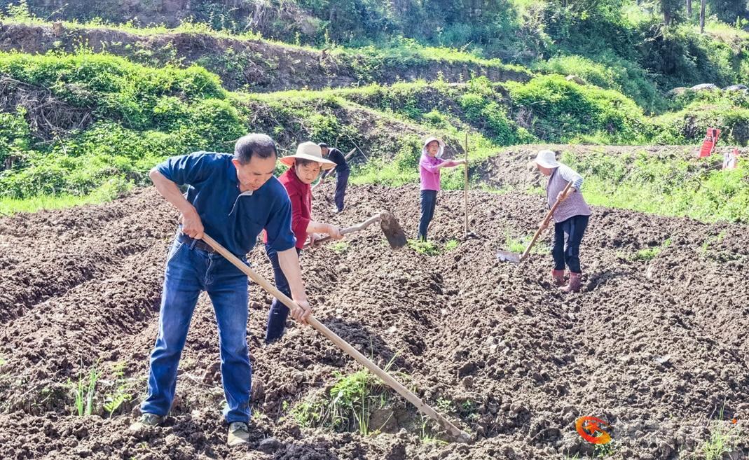 在汤济生合作社基地,十余位社员正进行工业辣椒苗的栽种准备工作,包括翻耕、施肥等环节。驻村工作队员在现场提供技术指导并协助解决生产问题,展现了基层干部与群众协同劳作的工作场景。